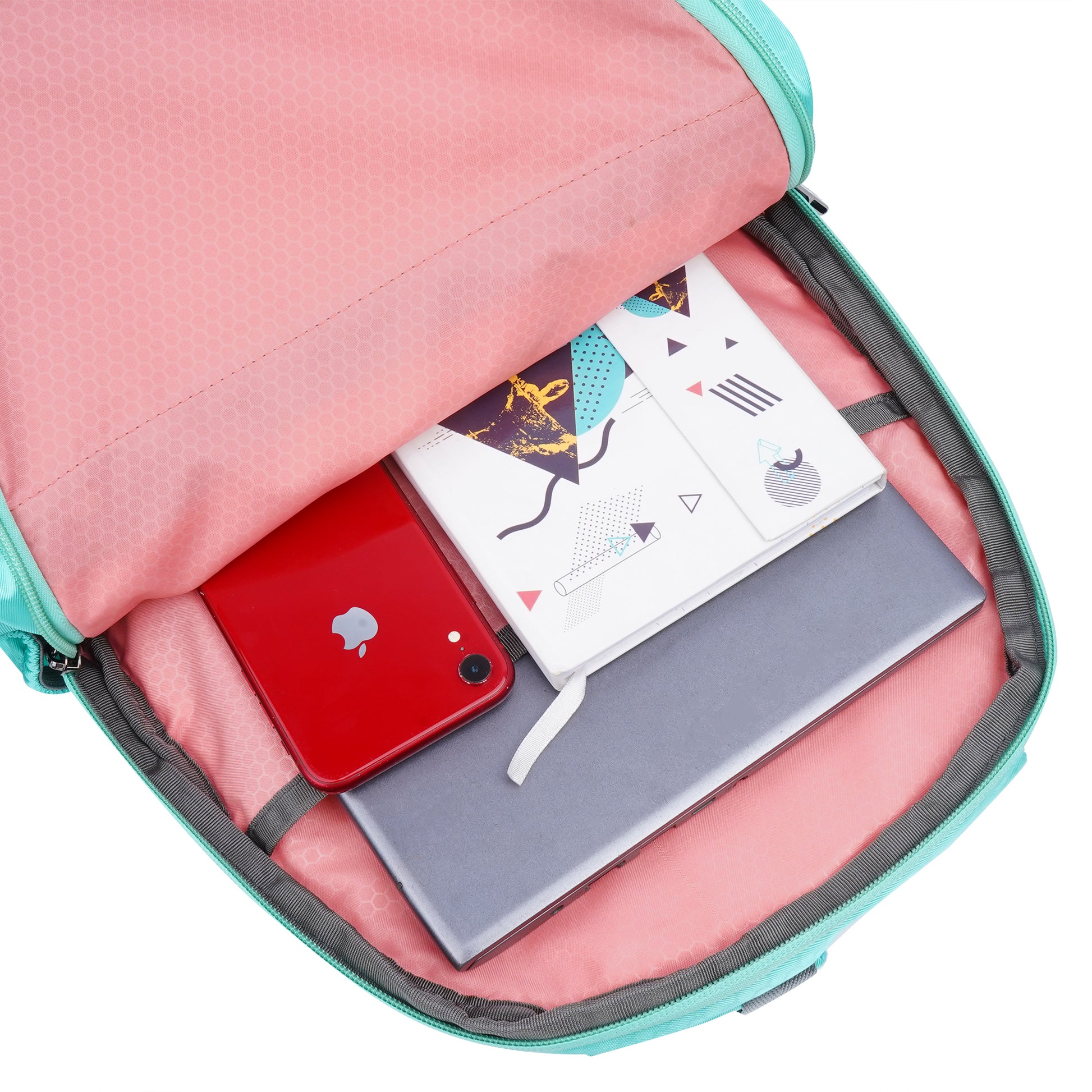 It has 2 main compartments, 1st with organizer 2nd for your files, documents or any other items like tiffin and padded Laptop and(max size 14 inches). In front there is 1 other pocket for easy access items. There are 2 pockets for bottle. Mesh padding on back & shoulder straps for superior comfort to reduce the load on the shoulders. At back there is provision for attaching bag to trolley using trolley strap.