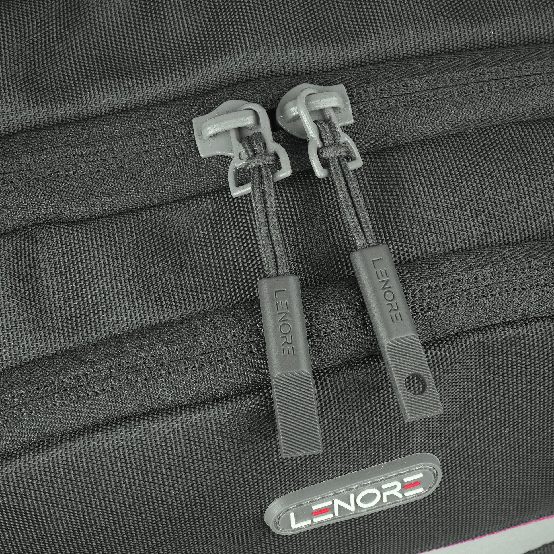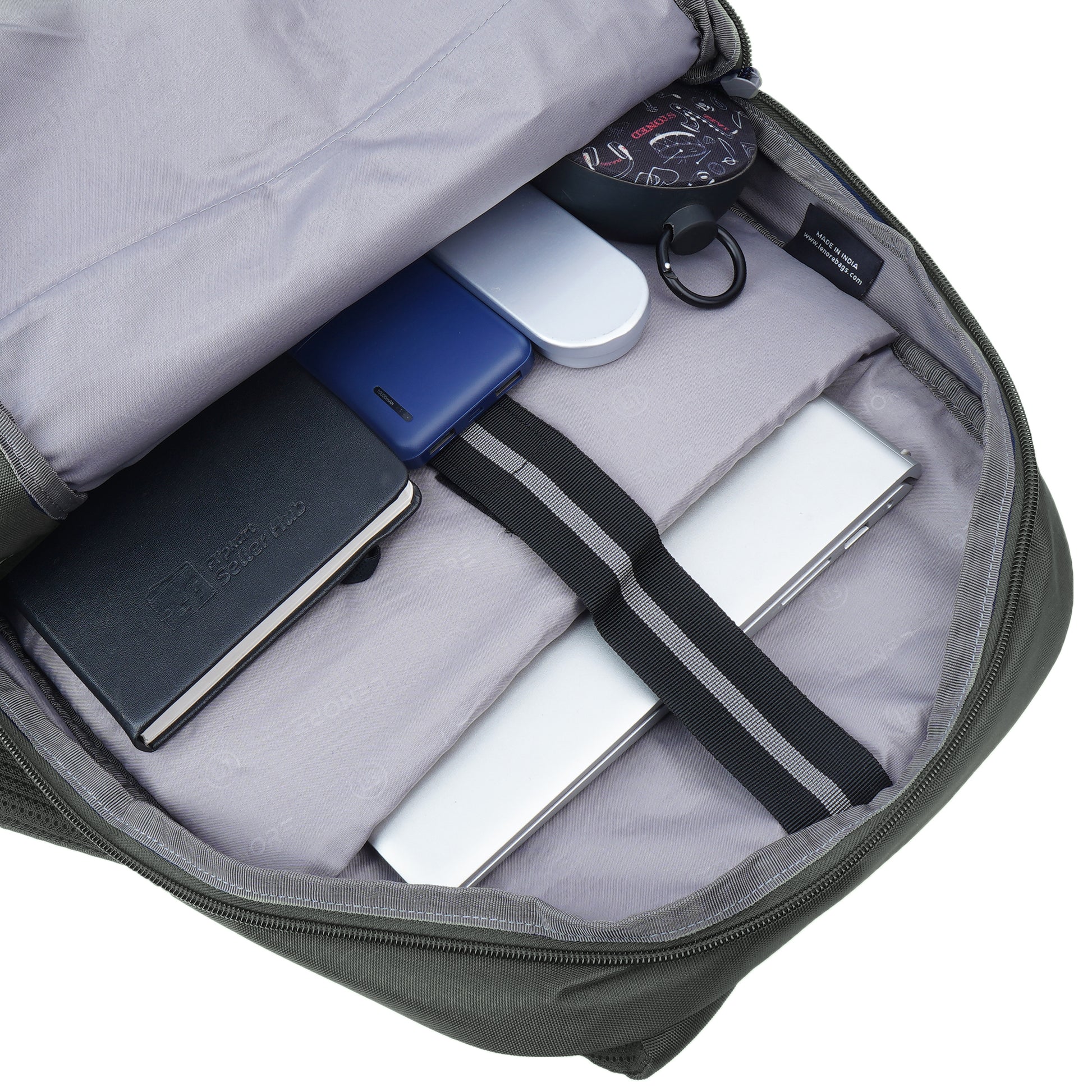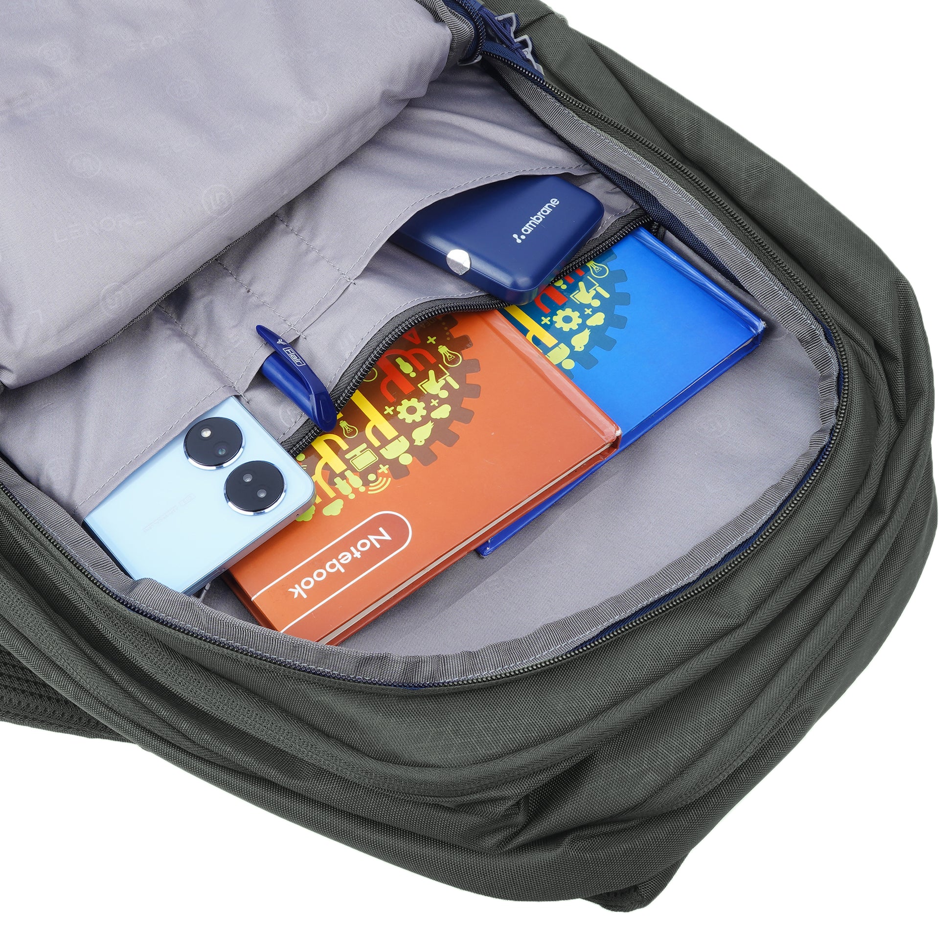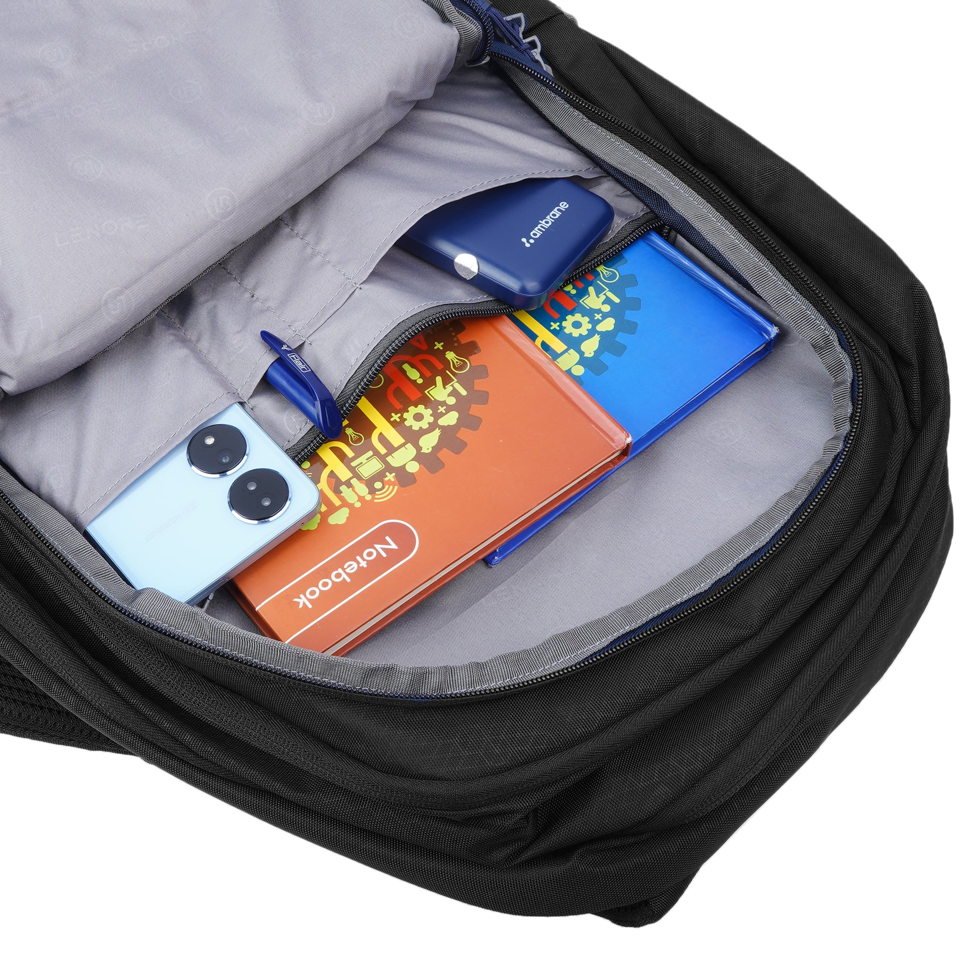 It has 3 main compartments, 1st with organizer 2nd for your files, documents or any other items like tiffin and the 3rd with padded Laptop and Tab sleeve (max size 15.6 inches). In front there are 2 other pockets for easy access items. There are 2 pockets for bottle. Mesh padding on back & shoulder straps for superior comfort to reduce the load on the shoulders.
