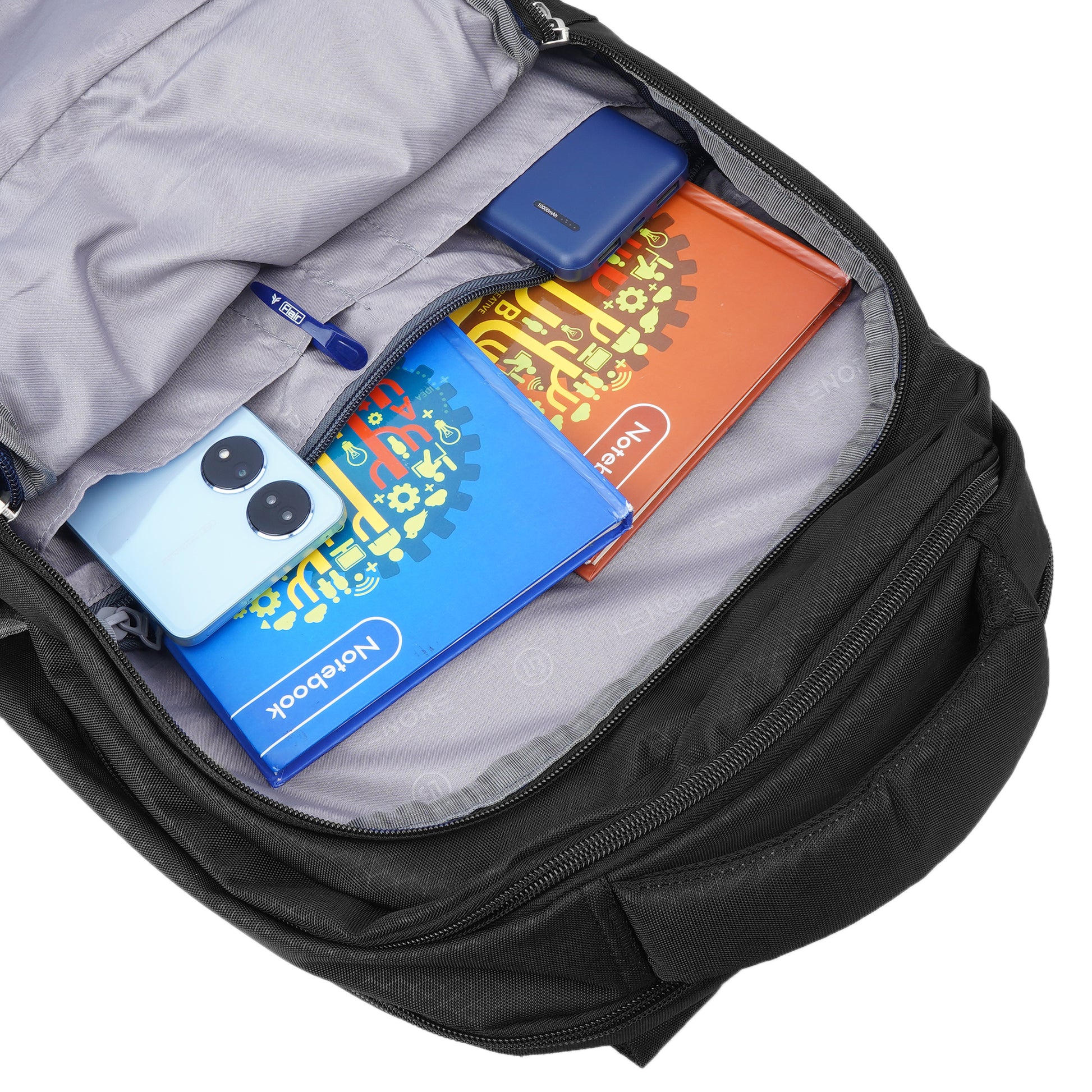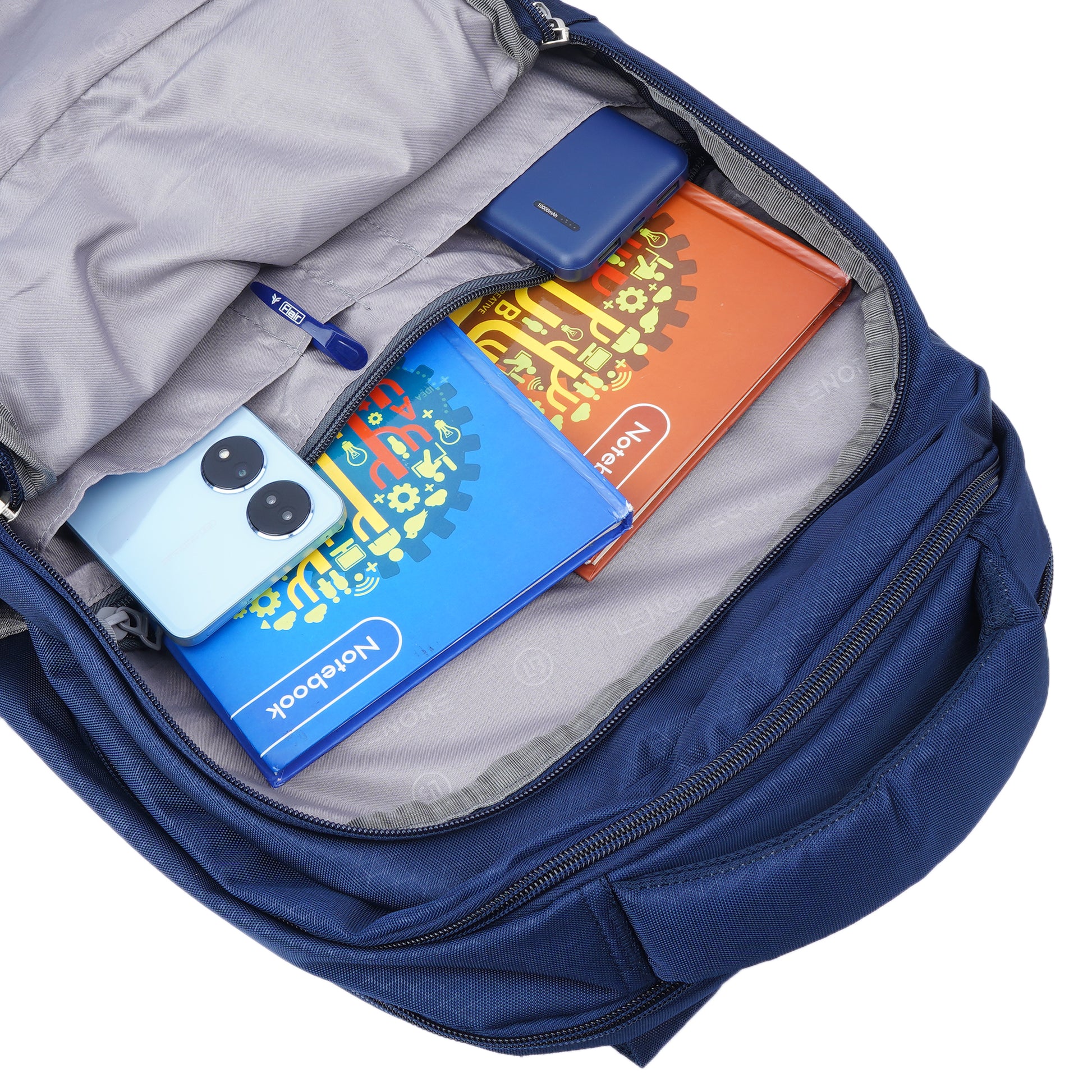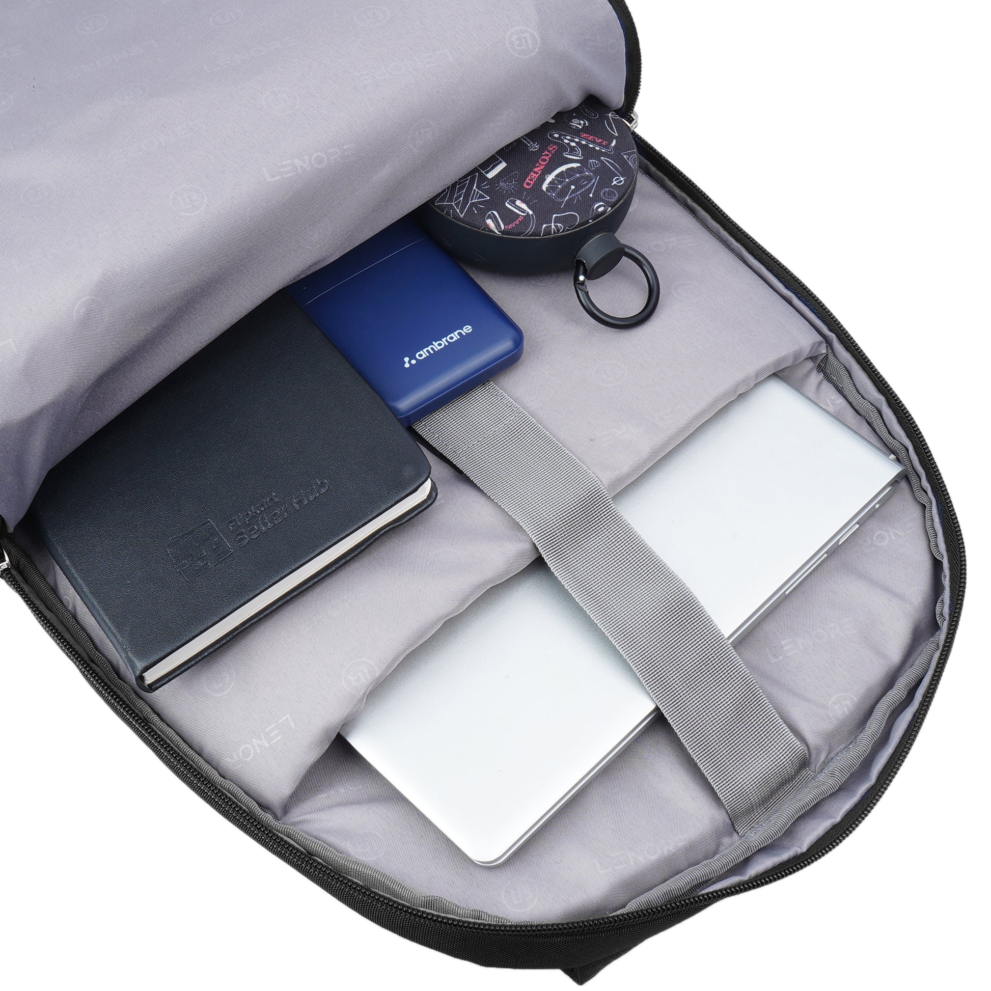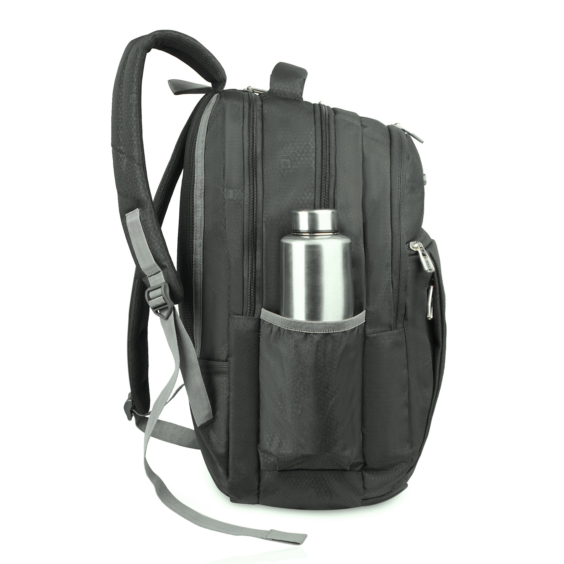 It has 3 main compartments, 1st with organizer 2nd for your files, documents or any other items like tiffin and the 3rd with padded Laptop and Tab sleeve (max size 15.6 inches). In front there are 2 other pockets for easy access items. There are 2 pockets for bottle. Mesh padding on back & shoulder straps for superior comfort to reduce the load on the shoulders.