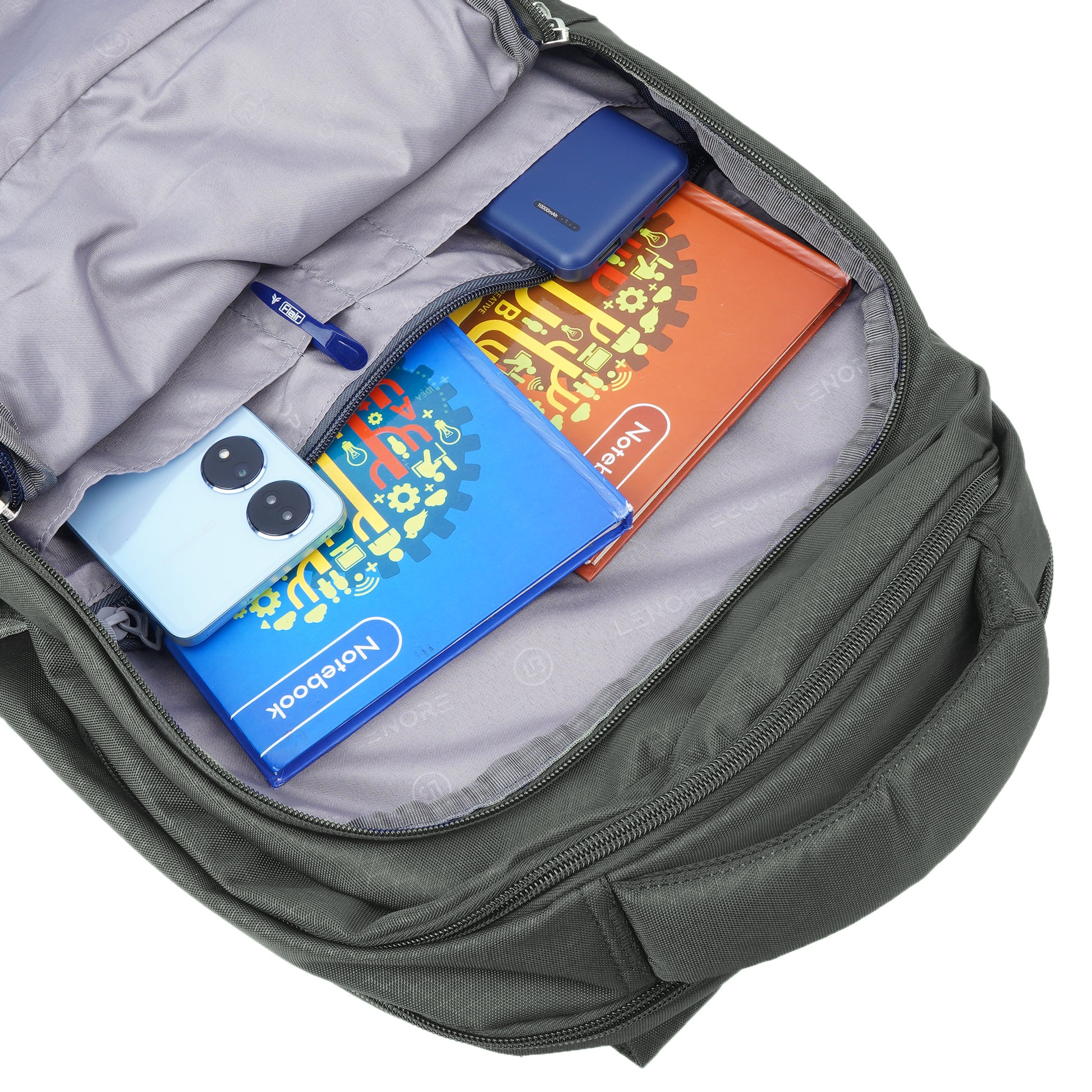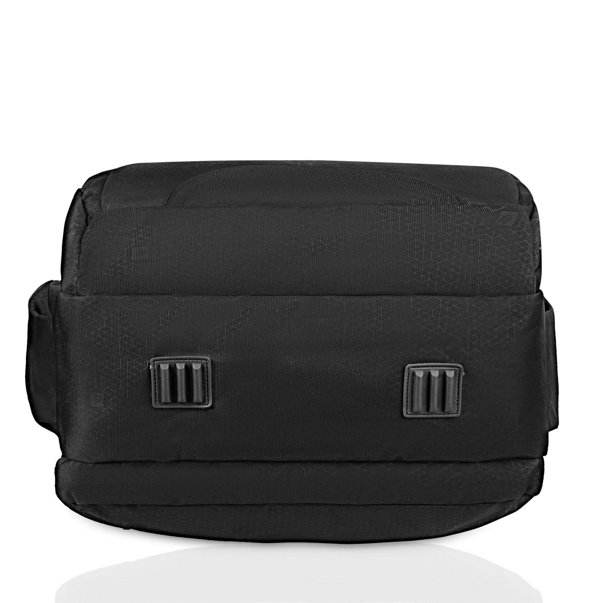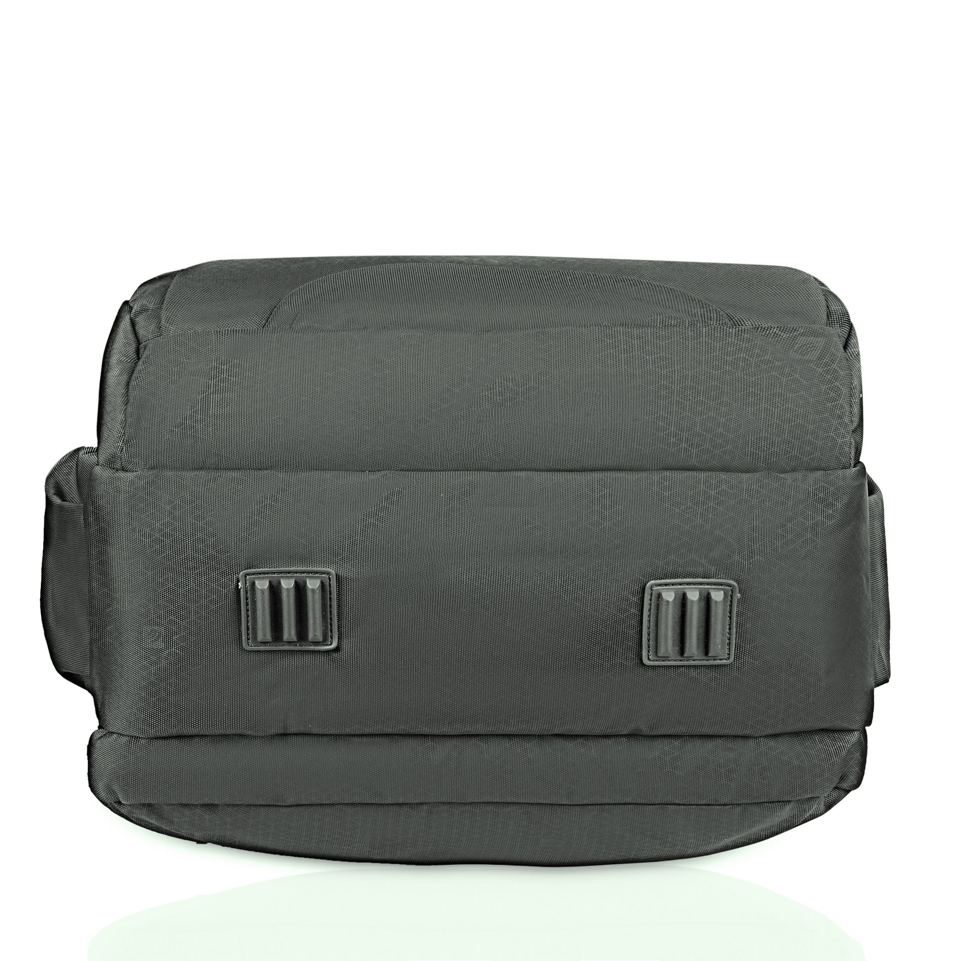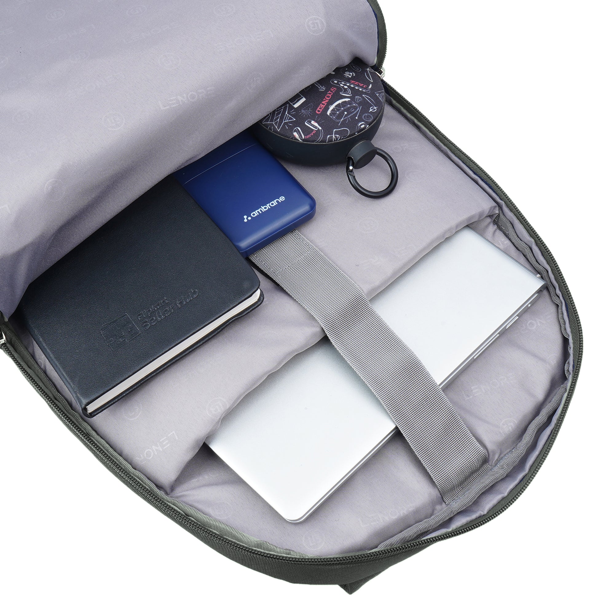 It has 3 main compartments, 1st with organizer 2nd for your files, documents or any other items like tiffin and the 3rd with padded Laptop and Tab sleeve (max size 15.6 inches). In front there are 2 other pockets for easy access items. There are 2 pockets for bottle. Mesh padding on back & shoulder straps for superior comfort to reduce the load on the shoulders.