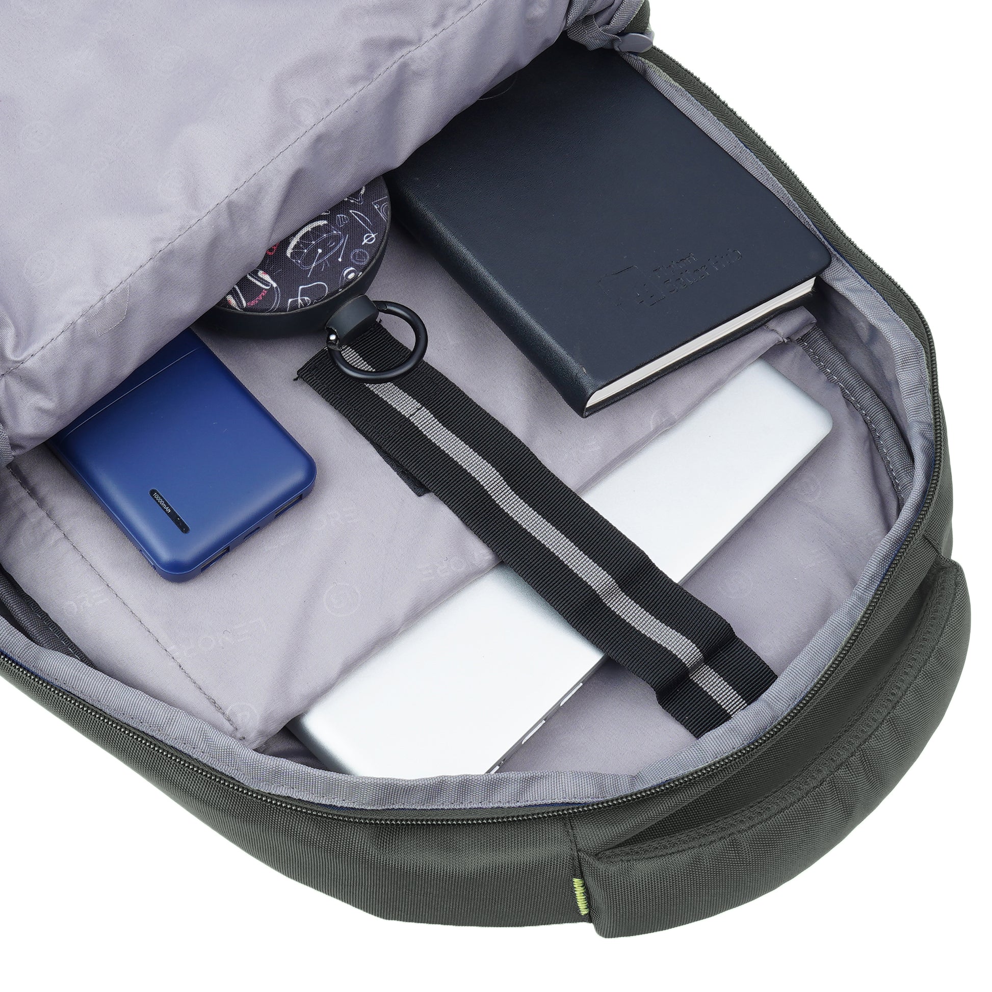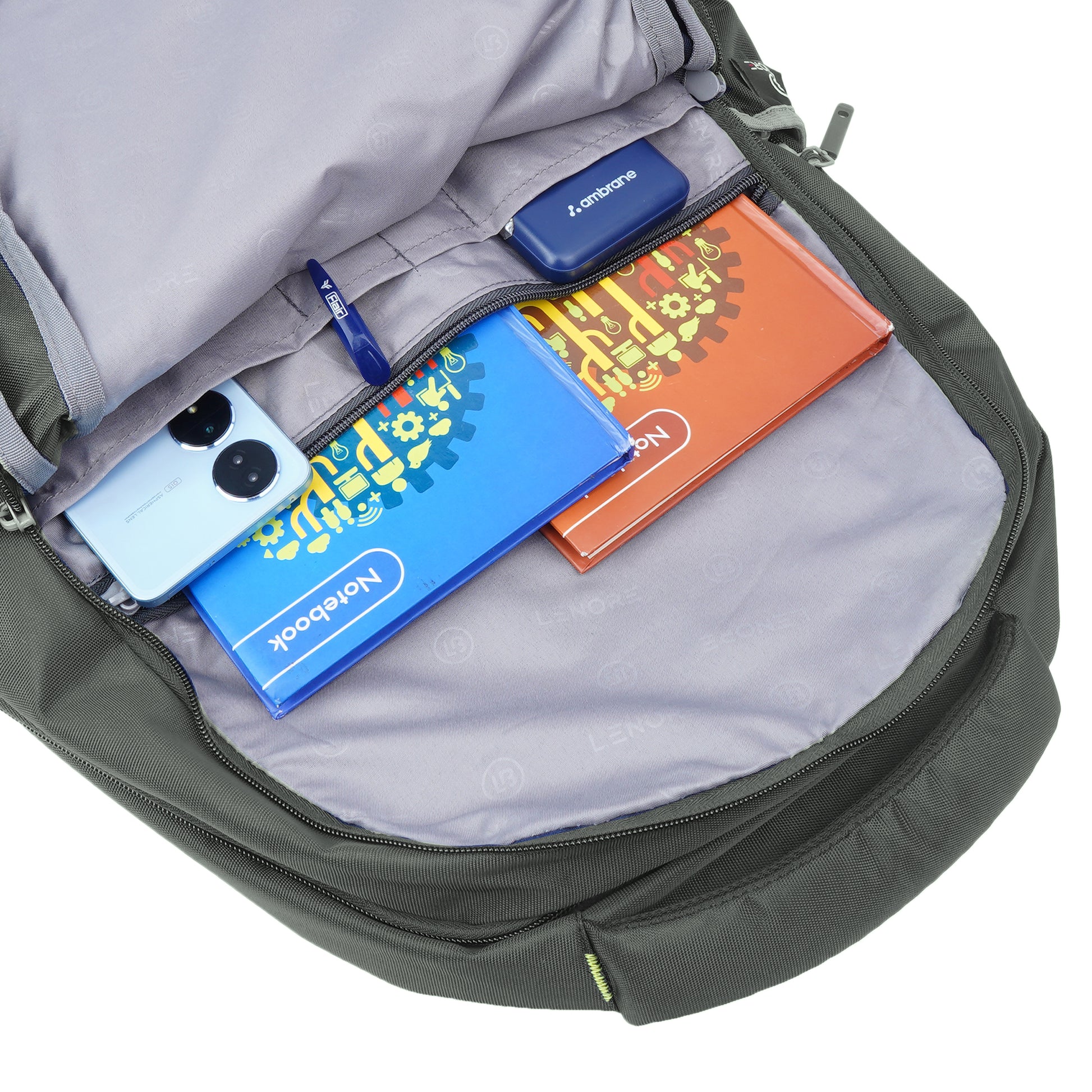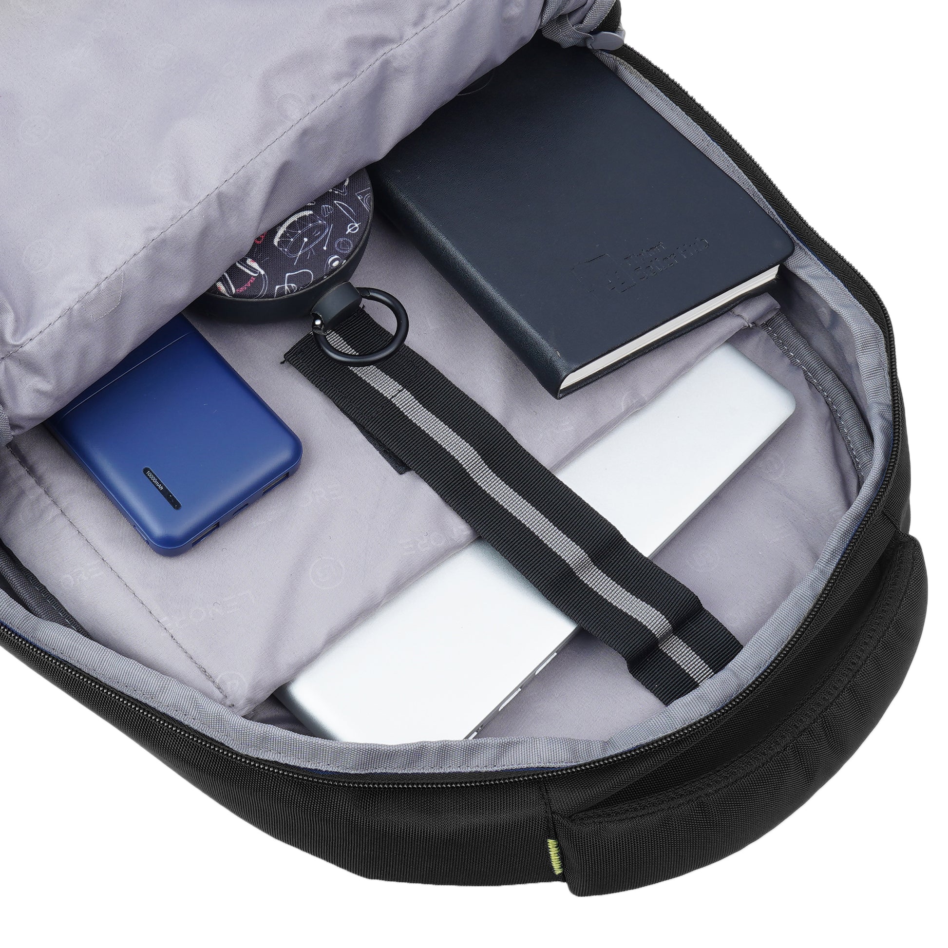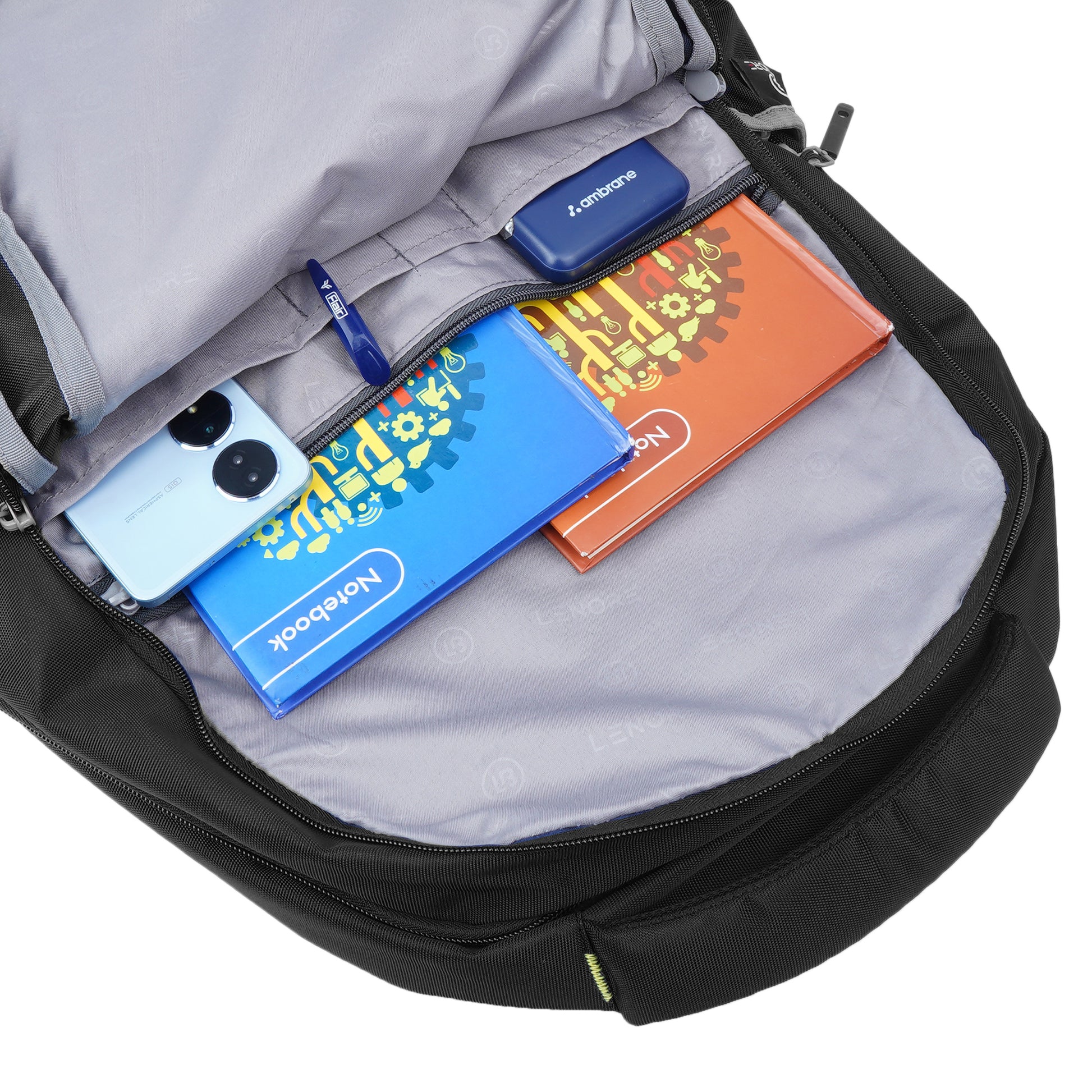 It has 3 main compartments, 1st with organizer 2nd for your files, documents or any other items like tiffin and the 3rd with padded Laptop and Tab sleeve (max size 15.6 inches). In front there are 2 other pockets for easy access items. There are 2 pockets for bottle. Mesh padding on back & shoulder straps for superior comfort to reduce the load on the shoulders. Include a rain cover to protect the backpack with dedicated pocket at bottom.