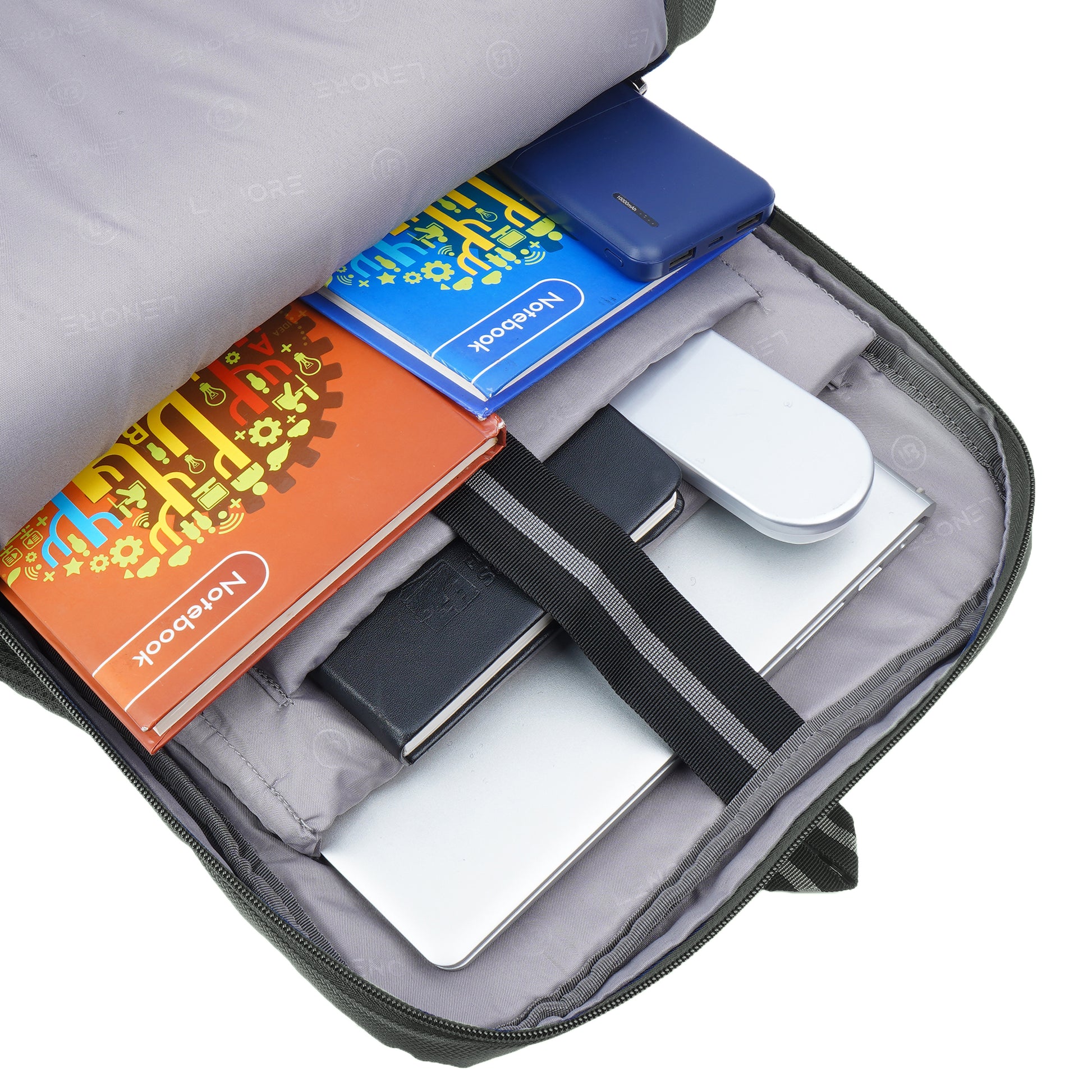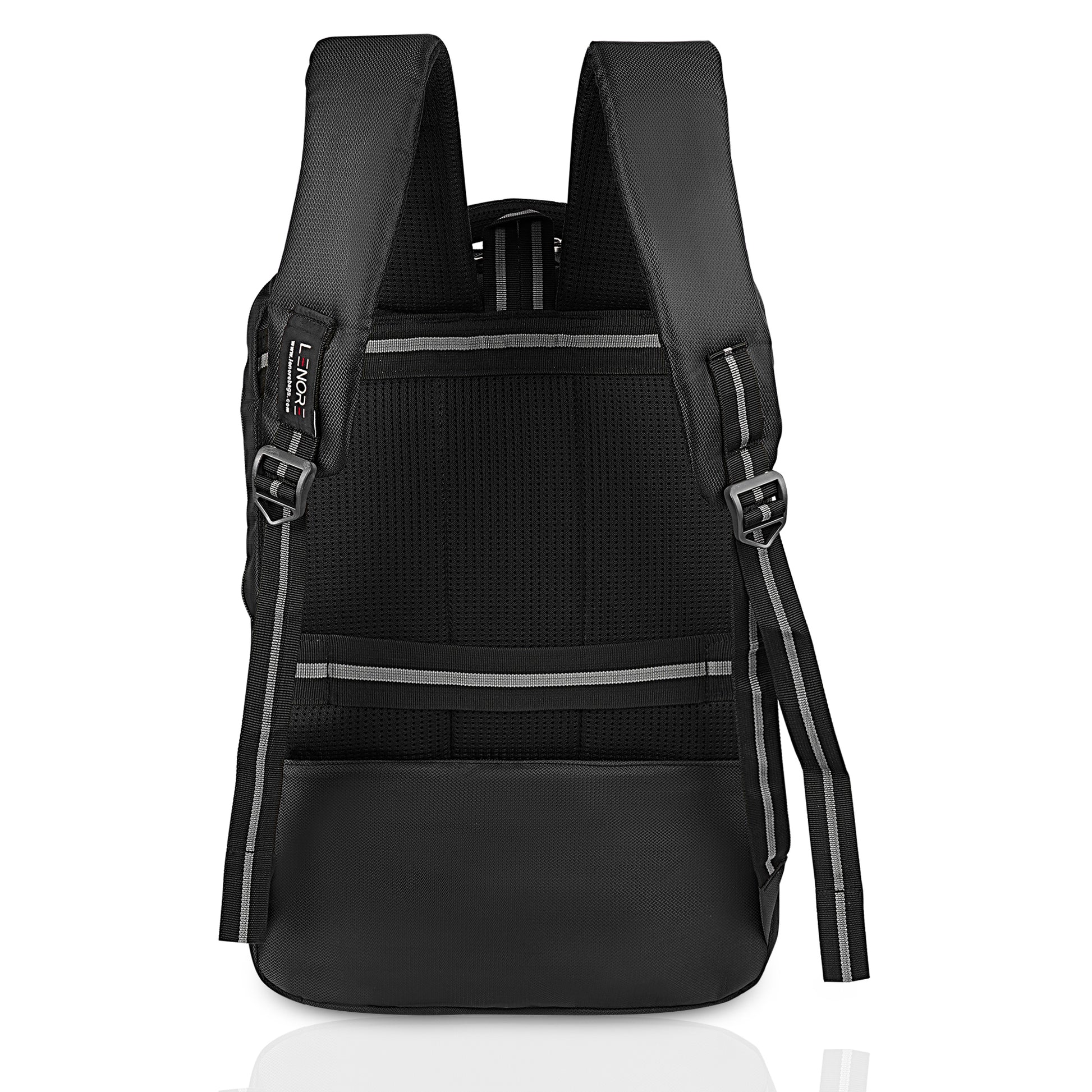 It has 3 main compartments, 1st with organizer 2nd for your files, documents or any other items like tiffin and the 3rd with padded Laptop and Tab sleeve (max size 15.6 inches). In front there are 2 other pockets for easy access items. There are 2 pockets for bottle. Mesh padding on back & shoulder straps for superior comfort to reduce the load on the shoulders.